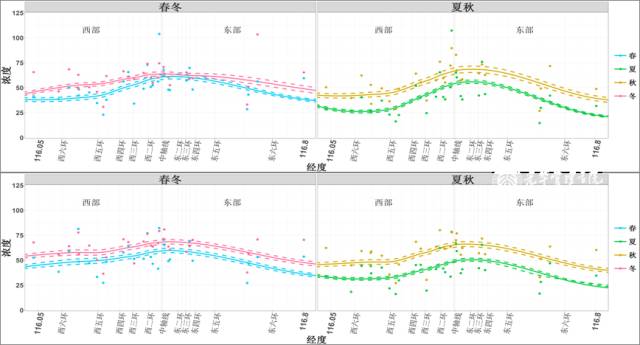 北京市二氧化氮(NO2)季均值浓度(微克/立方米)沿经度(东西方向)变化曲线图(图中从上至下为2015年-2016年)