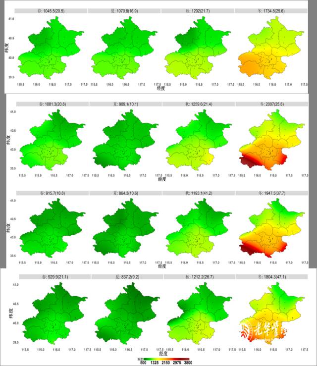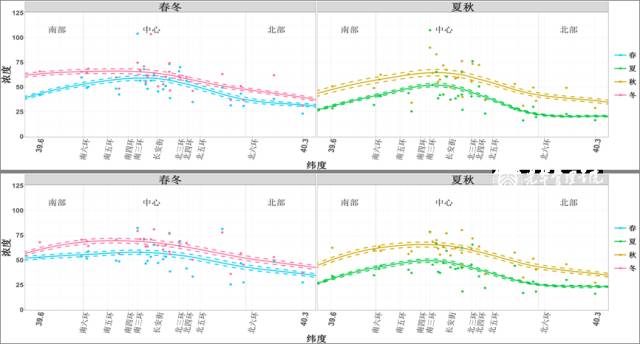 从空间分布来看,在春夏两季,中心区域的二氧化氮浓度显著高于北部和南部区域;但在冬季,由于外地传输,南部区域的浓度接近中心区域的浓度。在外地传输最低的夏季,中心区域的二氧化氮浓度比南部和北部区域分别高出50%和100%以上,这说明了北京自身保有的机动车尾气排放是最大的二氧化氮污染源。由于北京市近几年提高了油品排放标准,尽管机动车数量每年都在增加,但中心区域的二氧化氮浓度还是大致基本稳定。 虽然同处于北京市内,但是二氧化氮在空间分布上是很不均衡的。为了体现其具体的数据差别,研究团队在下面两组图中,分别绘制了北京市二氧化氮浓度在2015和2016年沿南北方向(纬度)和东西方向(经度)的变化曲线。 北京市二氧化氮(NO2)季均值浓度(微克/立方米)沿纬度(南北方向)变化曲线图 (图中从上至下为2015年-2016年) 实线为调整均值浓度,虚线为95%置信区间。点表示各个站点经气象调整后的季节平均浓度。 这两个图显示出,沿南北方向的二氧化氮峰域在南六环到北五环之间,沿东西方向的峰域在中轴线到东四环之间。南北方向的峰域相比东西方向要更缓、更长。 一氧化碳(CO): 明显改善出现在2015年 一氧化碳的产生主要有两个来源:一个是燃煤,其中炼焦炭(用于炼铁)会产生大量一氧化碳;另一个是汽车尾气的排放,尤其是机动车低速行驶时的汽油不完全燃烧。此外焚烧秸秆也会产生一氧化碳。 通过下面这组图,我们来看看一氧化碳的季均值浓度在北京的空间分布情况: 北京市一氧化碳(CO)季均值浓度(微克/立方米)在不同年份的空间分布地图 (图中从上至下为2013年-2016年) 图中数字代表季节平均浓度,括弧内为标准差。 可以看出,一氧化碳同样具有明显的季节特征,冬季是污染最重的季节,其次是秋季,夏季最低。此外,北京市的一氧化碳污染还有如下特征: 从空间分布的角度来看,从北到南,浓度呈增长趋势。 同2015年相比,2016年除中心区域夏季、北部区域秋季、南部区域冬季有显著下降之外,在其他季节持平或略有增加。其中中心区域的秋季均值浓度增加了3.0%。南部区域在夏秋两季分别有8.3%和9.3%的显著增加。 臭氧(O3): 夏季浓度超国标 2016改善甚微 臭氧具有强氧化性。低空臭氧是一种大气污染物。人类或动物吸入后对呼吸道、视觉和免疫系统会产生破坏,长时间暴露会使视觉敏感度和视力降低。它对植物和农作物也会造成损害,影响农作物产量。同时臭氧还可以同其它有机污染物和氮氧化物发生化学反应,造成二次污染。近年来,臭氧污染已经受到我国环保部门的重视。它已经成为除PM2.5之外最重要的指标性污染物。 研究发现二氧化氮在白天光照下会生成臭氧,因此在光照强度最高的中午和下午时段臭氧的浓度会最高。 下图显示了全天24小时臭氧季均值浓度在不同年份的空间分布地图及区域污染的程度。 北京市臭氧(O3)季均值浓度(微克/立方米)在不同年份的空间分布地图