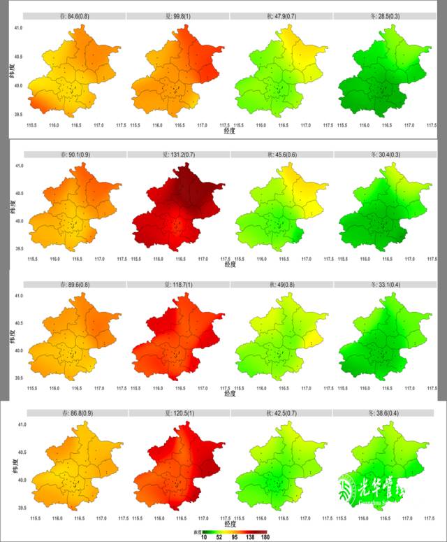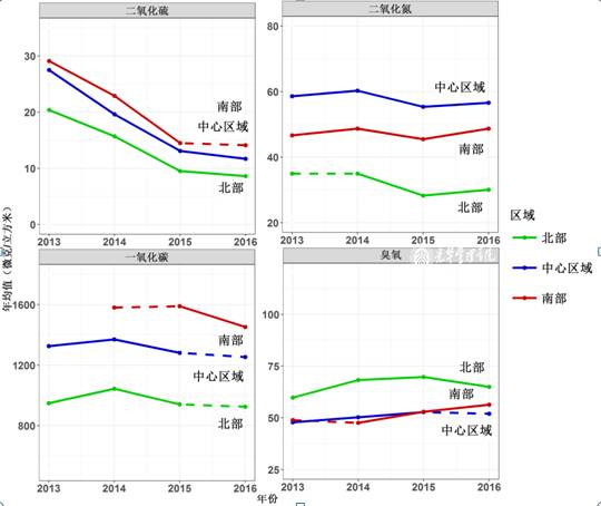 (图中从上至下为2013年-2016年) 图中数字代表季节平均浓度,括弧内为标准差。 从上图我们可以发现: 臭氧的污染具有很强的季节效应。由于夏季温度高、日照强烈,非常利于生成臭氧,因此,在北京的三个区域,夏季臭氧的浓度都是一年之中最高的。其次由高到低依次是春季、秋季和冬季。 臭氧的空间分布非常不同于PM2.5、PM10颗粒物和另外三种气体污染物,这具体表现为北部区域的臭氧浓度是三个区域中最高的。在最近两年,北部在春夏两季的臭氧浓度要比南部高出至少7.7%,比中心区域高出至少18.1%。除了2016年南部区域的臭氧均值浓度明显高于中心区域之外,在其它年份和季节,南部同中心的臭氧浓度差别并不大。 北部区域臭氧高的原因有两个,第一个原因是北部的一氧化氮(主要来自机动车的含氮有机物的不充分燃烧)浓度比中心和南部区域低。由于一氧化氮、臭氧、二氧化氮之间会发生氧化还原反应:,所以当一氧化氮浓度低的时候,消耗的臭氧较少,因而臭氧浓度较高。第二个原因是北部地区空气中的颗粒物(PM2.5和PM10)比中心和南部区域少,紫外线的照射更强,更有利于臭氧的生成。从年度变化的角度来看,对于三个区域而言,从2013年到2015年北京市的臭氧浓度均在增加。 2016年比2015年在中心和北部区域只有小量减少,但南部区域非常显著的增加。南部的浓度已经明显高于中心区域。 综合以上分析结果,我们发现近几年北京市臭氧的改善甚微,并在2016年有加重的迹象。这尤其体现在浓度高的东北部和东南部地区的夏季。这意味着北京目前在PM2.5污染相对较轻的夏季,臭氧浓度已经超标。 历年变化:二氧化硫改善最大,其他污染物不容乐观 我们再来总体看看北京市不同区域四种污染物近年来是否有明显改善。下图展示了各区域四种污染物的逐年变化趋势: 北京市不同区域四种污染物年均值浓度比较 实线代表相比上一年有显著(5%水平)减少或增加,虚线代表相比上一年没有显著变化。 由此我们 发现: 二氧化硫:从2014年开始,三个区域二氧化硫浓度均有显著减少(除2016年中心区域外),但是,2016年各个区域下降幅度减少。 臭氧:近几年北京市三个区域臭氧的改善甚微,2016年南部区域与2015年相比有显著上升,北部和中心区域比2013年略有升高。 二氧化氮:最大的改善发生在2015年,它和2014年浓度相比有相对较大的减少,全年的改善在6.6%至19.1%之间。2016年比2015年不仅没有改善,反而增加了。 一氧化碳:主要改善也是发生在2015年(四个季节比2014年显著下降3.0%-15.3%)。2016年除了南部区域,北部和中心区域几乎和2013年持平。 北京改善空气质量应该这么做 北京近几年大气环境改善的一个亮点是二氧化硫浓度的大幅度下降。从2015年开始,在夏秋两季,从南到北三个区域的二氧化硫浓度均已进入个位数时代。这反映了北京市自2014年开始实施的“煤改气”和“煤改电”使得煤炭消费量大幅下降,在减硫方面卓有成效。二氧化硫的大幅改善为其它污染物治理提供了成功案例和经验。 过去四年北京市二氧化氮和一氧化碳的污染状况改善有限,在南部区域甚至有增加的态势;臭氧整体呈增加趋势。我们认为,北京过去几年PM2.5浓度下降主要是二氧化硫减少所驱动的。在北京二氧化硫浓度已经显著下降、并无法控制污染物从外部输入的前提下,要进一步降低北京的PM2.5浓度, 必须在氮氧化物和一氧化碳的减排上下功夫。也就是说,北京下一步PM2.5的下降空间应该重点放在对机动车排放的管控方面。这将直接减少氮氧化物(含二氧化氮)、一氧化碳和PM2.5的浓度,间接减少二次化学反应所产生的PM2.5,同时又能遏制臭氧增加的势头。 编辑:张伟