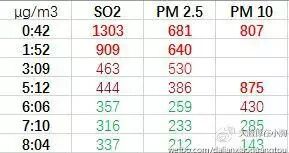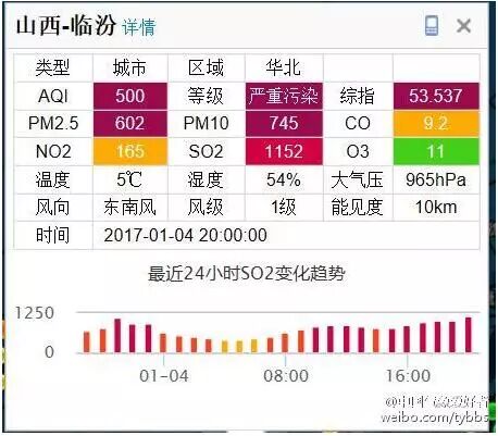 5日上午,中国科学院气象学博士后李汀在自己的微博上发表了一篇文章引发热议,截至5日下午7点,文章阅读量超过500万。在这篇文章中,李汀称在网上看到,山西省临汾市5日0点55分时二氧化硫浓度值达到了每立方米1303微克。之后的几天稍有好转,但很快二氧化硫指标依旧超标5倍以上。